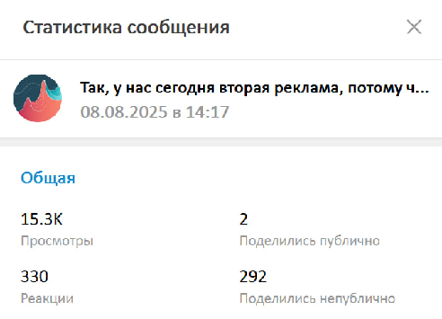 Пост 15,3 тысячи просмотров, 330 реакций (основные — огонь и палец вверх, всего 10 отрицательных), непубличных 292 репоста + 2 публичных.