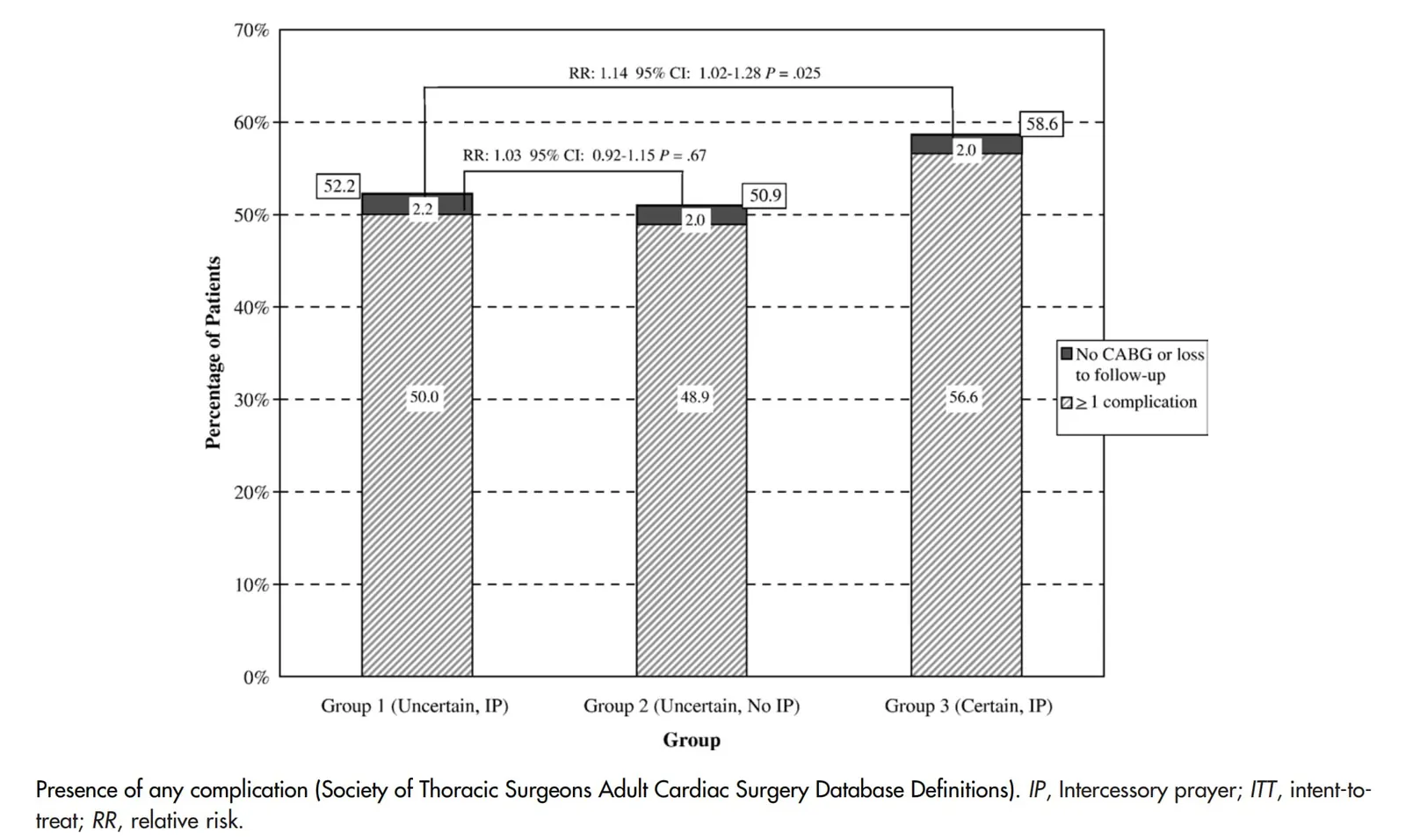 Между группами 1 и 2 не было значимых различий в частоте осложнений (52% vs 51%, относительный риск 1,02). То есть сама по себе заступническая молитва не повлияла на частоту осложнений. В группе 3 частота осложнений была значимо выше, чем в группе 1 (59% vs 52%, относительный риск 1,14, p=0,025). То есть уверенность в том, что за тебя молятся, была связана с более высокой частотой осложнений.