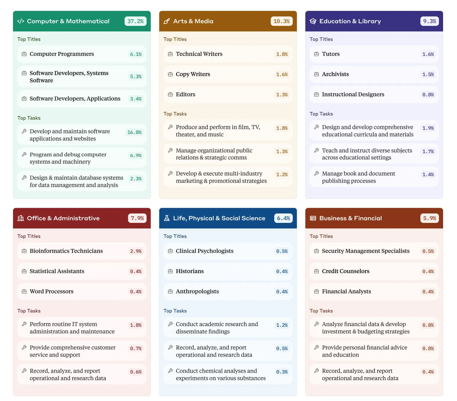 — 36% профессий используют гопоту как минимум для четверти своих задач (в смысле, из возможных задач каждая четвёртая может решаться нейросетью, но не обязательно будет решаться — возможно, для простых люди используют LLM, для сложных таких же предпочитают морщить голову).
