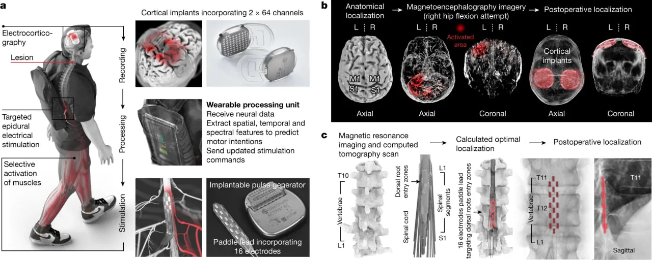 Есть пациент с разрывом спинного мозга. Сигналы от головного мозга не доходят до того места, откуда надо шевелить ногами. Сделали две штуки: считыватель на голову, который пытается понять, что пользователь хочет сделать ногами, и устройство, которое повторяет этот сигнал на управление в нерв после разрыва. Назвали это цифровым мостом или интерфейсом мозг-позвоночник.