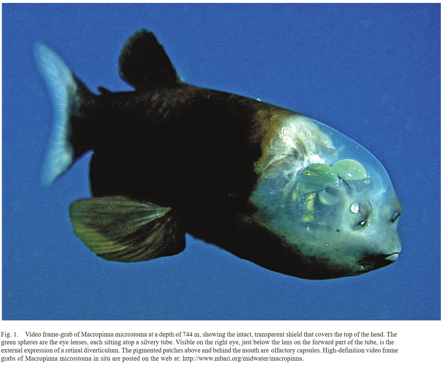 Сегодня у нас в гостях офигенно странная рыба-бочкоглаз, он же коротконосый опистопрокт (Opisthoproctus soleatus). И ещё сразу Macropinna microstoma.