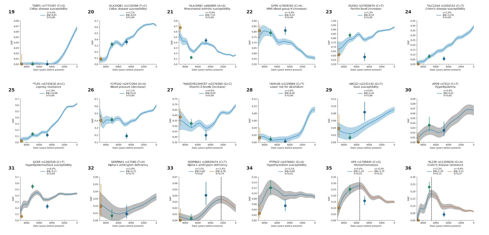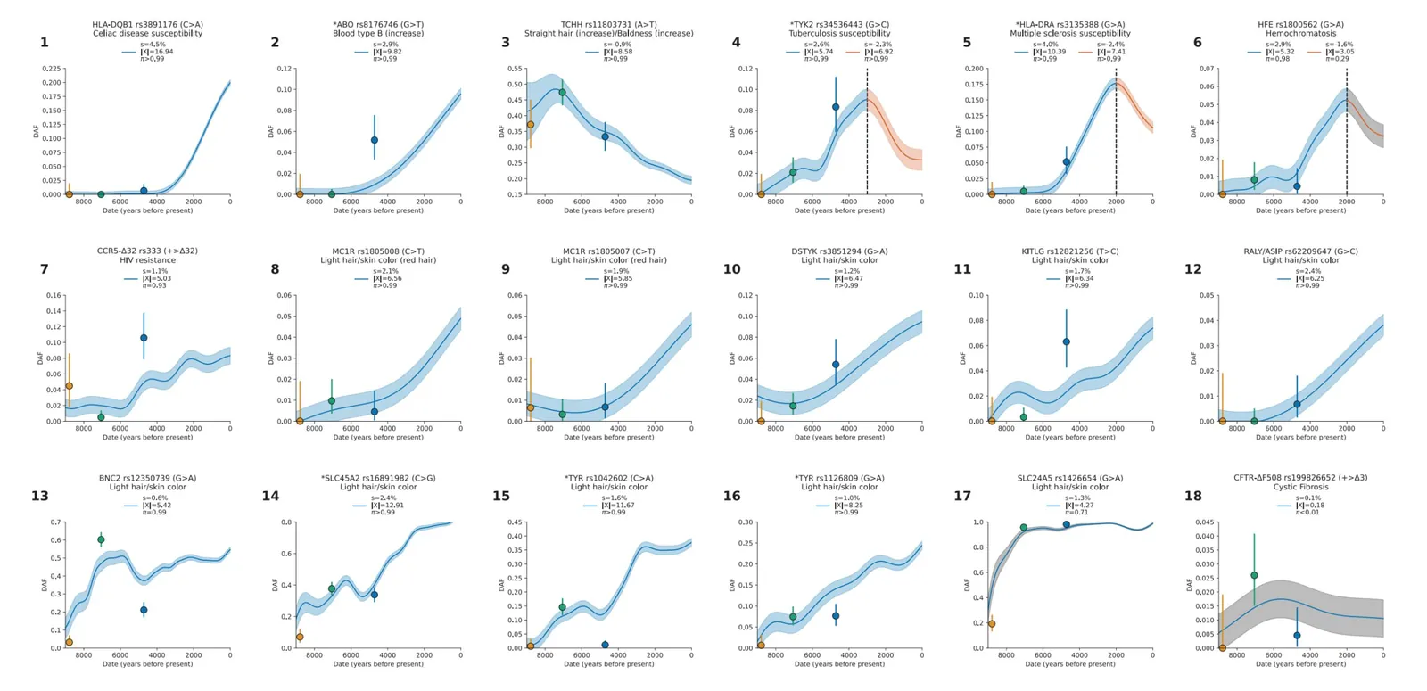 Вот примеры: — Суммарный эффект многих генов снизил процент жира в организме за последние 10 тысяч лет. В смысле, вы не так быстро жирнеете с тех пор, как изобрели сельское хозяйство. ВНЕЗАПНО, выгодно быть менее жирным. Изменения достигались через скоординированные изменения в частотах разных аллелей. — Обнаружено 9 локусов с признаками отбора в пользу более светлой кожи. Это вы знаете от эндокринолога — сидеть дома темно и страшно, поэтому нужно больше витамина D. Светлая кожа даёт больше такого витамина, поэтому все викинги белокожие. Ещё потому, что они не воровали некрасивых женщин, но в основном — из-за меньшего числа света в Исландии и Норвегии и большего процента зерна в рационе вместо нормального мяса. Сигналов отбора на темную кожу не обнаружено. — Снизилась частота генетических механизмов запуска биполярки и шизофрении. Кажется, быть шизом не очень выгодно в современном обществе (но, скорее всего, это исправление багов после других адаптаций). — Больше аллелей, которые связывают с повышенным интеллектом. Умным быть выгоднее. Точнее, в целом было выгоднее до настоящего момента, сейчас уже может и не факт) — Больше аллелей, которые связывают с замедлением старения. Дольше жить прикольнее. — Аллель, связанный с прямыми волосами и мужским облысением, снизился с 50% до 20% за последние 7 тысяч лет (не волнуйтесь, это всего плюс пара процентов шансов не облысеть в 40 для современного европейца). Раньше думали, что он, наоборот, повышается. — Выросла частота III группы крови (B) с нуля до 8% за 6 тысяч лет. С учётом, что носители из Азии, а исследование шло преимущественно по европейским могильникам, возможно, речь банально про миграцию. — Фактор риска рассеянного склероза, вырос с нуля до 18% с 6 до 2 тысяч лет назад, а потом стал обратно закукоживаться по настоящее время. — Аллель, связанный с высоким риском целиакии, за последние 4 тысячи лет почти с нуля набрал популярность 20%. Что важно, земледелие появилось 10 тысяч лет назад, и 6 тысяч лет он не рос. Возможно, надо было набрать плотность населения. — Аллель с повышением риска туберкулёза сначала вырос с 2% до 9% от 5500 до 3000 лет до даты исследования, а потом по сегодня стал снижаться до 3%. Кажется, это связано с тем, что туберкулёз был серьёзной проблемой примерно 3 тысячи лет назад. — Гемохроматоз: от 1 до 5% с 5 тысячи до 2 тысячи лет, а последние 2 тысячи лет снижается до 3%. Вероятно, диета человека снова обогатилась железом. — CCR5-Δ32, обеспечивающий резистентность к ВИЧ-1, рос с 6 тысяч лет назад по 2 тысячи лет назад с 2% до 8%. Хоть ВИЧ-1 и появился позже, кажется, он ещё работал против чумы и оспы.