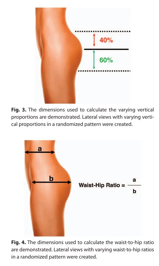 Основные результаты: — Наиболее привлекательное соотношение талии к бедрам при виде сзади — 0,65 (44% респондентов), затем 0,6 (25% респондентов). Это мы отметили стрелочкой на фото выше среди ассортимента. — При виде сбоку наиболее привлекательное соотношение талии к бедрам — 0,7. — Наиболее привлекательное расположение латерального выступа ягодиц — в нижней части (26% предпочли нижнюю выпуклость, 23% — расположение на нижних 70% высоты ягодиц). — При виде сбоку наиболее привлекательно расположение самой выступающей точки на середине высоты ягодиц (50:50). — Не было выявлено значительных различий в предпочтениях между возрастными группами. — Мужчины и женщины имели одинаковые предпочтения. — Не обнаружено явных различий между этническими группами.