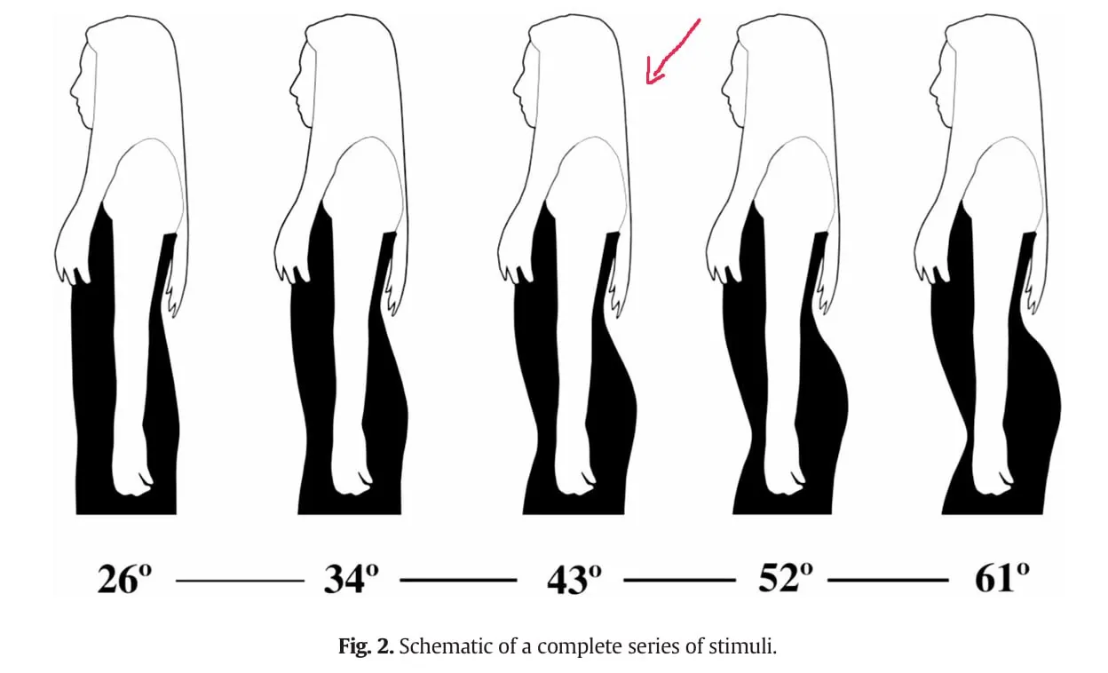 — Оптимальный угол изгиба поясницы у женщин (около 45,5°) сформировался в ходе эволюции как компромисс между недостаточным и чрезмерным изгибом. Оба эти крайних состояния связаны с проблемами во время беременности и родов. — Привлекательность женщин для мужчин достигала пика при угле, близком к теоретически оптимальному (45,5°). — Дальше попытались выяснить, что именно привлекает мужчин — сам по себе изгиб поясницы или объем ягодиц, который тоже влияет на визуальное восприятие изгиба. — Мужчины предпочитают женщин, у которых изгиб поясницы обусловлен именно клиновидностью позвонков, а не объемом ягодиц. — При углах выше оптимального картина была сложнее, что авторы объясняют влиянием других факторов (например, соотношения талии и бедер).