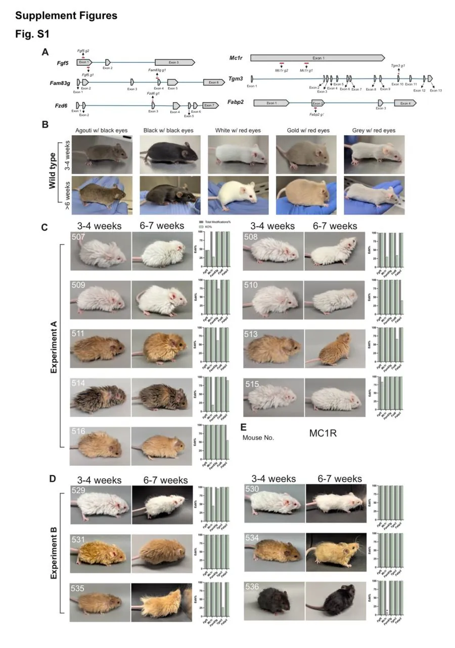 Нашли 10 генов, которые отвечали за волосы и метаболизм липидов. Там пигменты шерсти, текстура, куда волосы растут (что характерно, все наружу), волнистость шерсти, транспорт веществ и т.п. Максимум можно редактировать 7 сразу, поэтому появились некоторые особенности серий мышей.