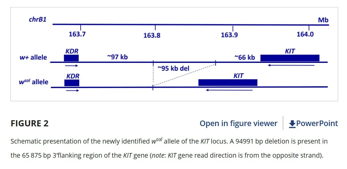 Теперь почему важно, что это удаление рядом. Даже если сам ген не поврежден, участки ДНК рядом с ним часто контролируют, как и когда этот ген включается и выключается. Удаление большого куска рядом с геном KIT, вероятно, меняет геометрию участка и нарушает его правильную работу, что и приводит к особенностям в распределении пигмента. У других животных (коров, коз, лошадей) похожие изменения рядом с геном KIT тоже вызывают изменения в окрасе шерсти. Например, у пакистанских коз похожая большая пропажа в коде ДНК рядом с геном KIT делает их белыми или бело-пятнистыми.