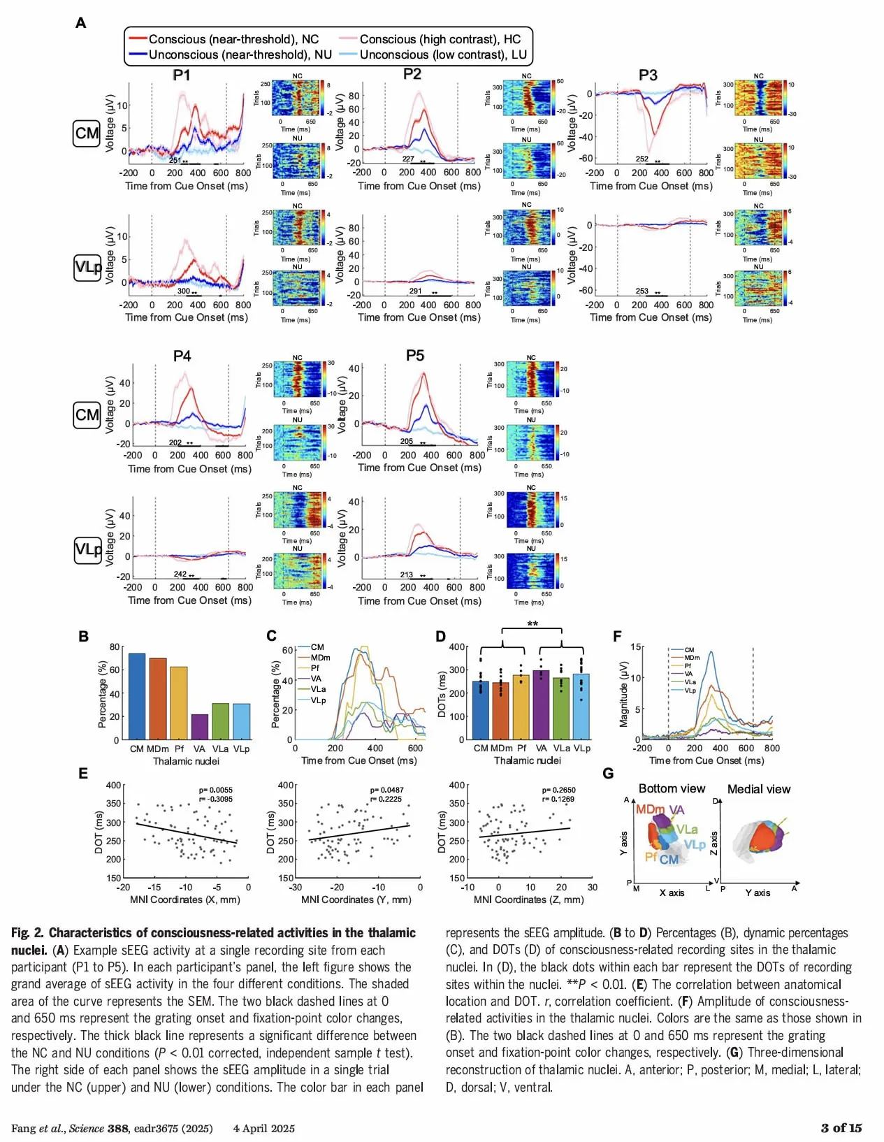 Результаты: — Вентральные ядра — классические передатчики сенсорной информации. — Интраламинарные и медиальные (imTha) — ядра высшего порядка. Именно они были главными подозреваемыми. imTha включаются первыми и сильнее всех. Когда человек осознавал картинку, активность в ядрах высшего порядка вспыхивала примерно через 200 миллисекунд после появления картинки. Это происходило раньше, чем активность в префронтальной коре (которая считается центром принятия решений), и активность там была сильнее, чем в обычных сенсорных ядрах. — Поток информации шел направленно: от imTha к префронтальной коре. Они синхронизировались на низких частотах (тета-ритм, 2–8 Гц). Таламус своей медленной волной модулирует высокую активность в коре. — Может, это просто подготовка к движению глаз? Нет, построили предсказательную модель, и точность предсказания осознания была выше, чем предсказание того, куда человек посмотрит или насколько яркой была картинка. Это именно сознание, а не движение глаз или внимание. — Если активность в imTha была слабой, сигнал затухал, и человек сообщал, что ничего не видел, даже если картинка на экране была. Если активность была сильной — доступ открывался, сигнал шел в кору, и человек осознавал увиденное. — Больше всего решает центромедианное ядро — очень старая часть мозга. Она есть у многих животных, но у приматов и человека она развита особенно сильно. Оно раскидывает свои аксоны по всей коре мозга и глубоким структурам базальным ганглиям. Раньше считалось, что это инфраструктура, что-то вроде управления питанием. Теперь есть подозрение, что по этим кабелям идут контент и управляющие импульсы.