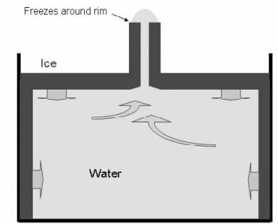 - Вода замерзает с краёв, а лёд больше в объёме на 9%, и если он зацепился за край стенки, то не всплывает, а давит на воду под собой, формируя такое сопло в этой треугольной дырочке.