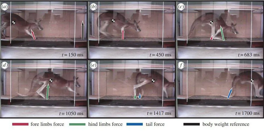 Всё, что не хвост, кенгуру использует при ходьбе попарно. Сначала ставит на землю пару передних лап, потом упирается в землю хвостом и только тогда отрывает пару задних лап для движения вперёд. Хвост не просто не даёт упасть как опора, но ещё и толкает тело вперёд как лишняя нога. Понятно, что это на самом деле не нога никакая, но функционал тут похожий. В момент этого толчка хвост берёт на себя примерно 36% массы всей кенгурятины. Тормозить им при этом нельзя — можно только отталкиваться за счёт кучи мышц и каркаса из 20 позвонков.