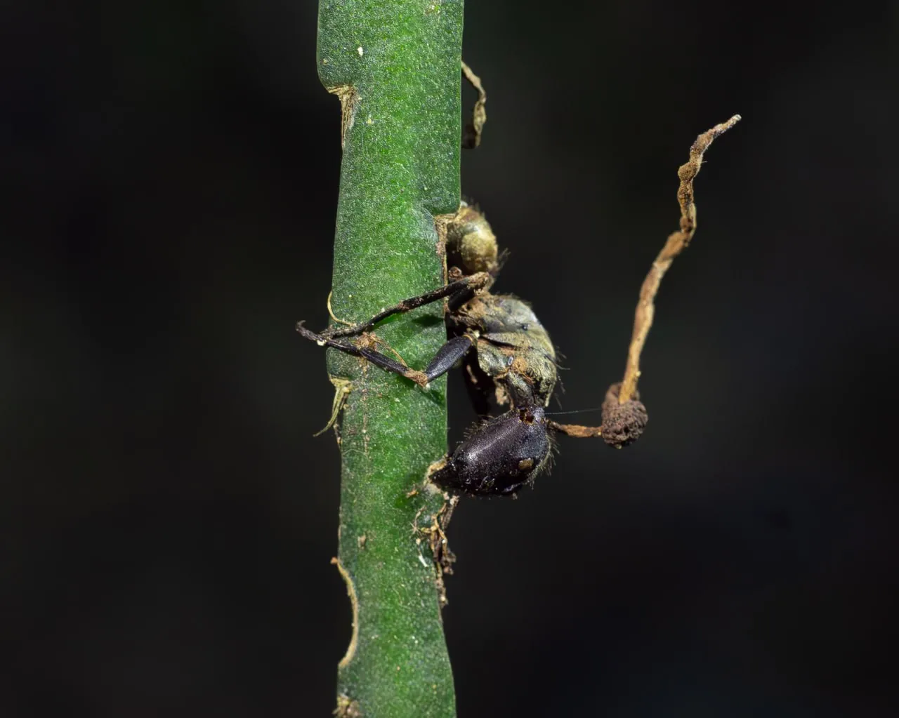 Вот муравей-зомби прибыл в нужную точку. Сильный спазм — и мышцы челюстей получили команду сжаться. Разжать уже нельзя. Муравей умирает и остаётся вот так висеть на листочке. В это время его уже давно жрут изнутри. Через несколько дней гриб пробивается наружу и начинает новый цикл со спорами.